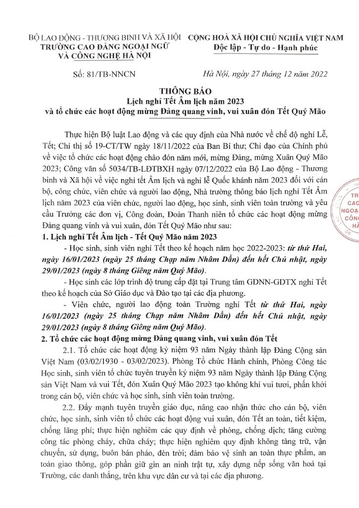 - Thông điệp năm mới 2023 của Hiệu trưởng Trường Cao đẳng Ngoại ngữ và Công nghệ Hà Nội